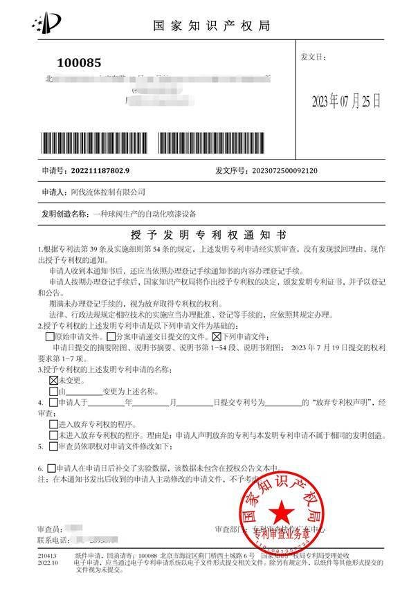 2023年7月25日,pa视讯流体控制有限公司(以下简称“AFA公司”)再获两项国家发明专利授权,这是继今年6月份《一种耐磨C型球阀》获得国家发明专利后的又一重大突破。这两项发明专利分别名为《一种球阀生产自动化喷漆设备》和《一种具有调节功能的C型球阀》。至此,AFA公司获得国家发明专利授权数已达到4项。